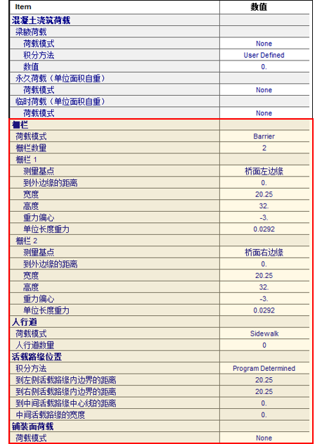 柵欄荷載:用于指定橋梁兩側(cè)(或單側(cè))的護(hù)欄荷載,如果沒有則將數(shù)量設(shè)置為“0”。一般來說,左側(cè)護(hù)欄以主梁左側(cè)邊緣為基點(diǎn),右側(cè)護(hù)欄以主梁右側(cè)邊緣為基點(diǎn),指定其布置位置。用戶需指定柵欄的高度、寬度、重力偏心距離、單位長度的重力。