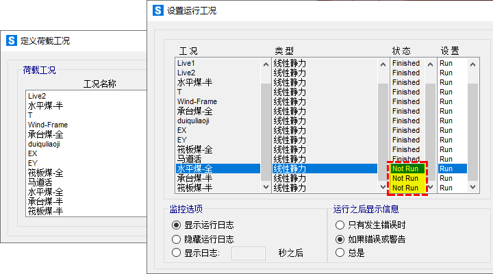 此外,非法字符不僅可能引起設(shè)計結(jié)果顯示異常,還可能導(dǎo)致無法運行某些荷載工況。如圖6所示,荷載工況名稱中包含中文字符,導(dǎo)致程序無法運行部分荷載工況。