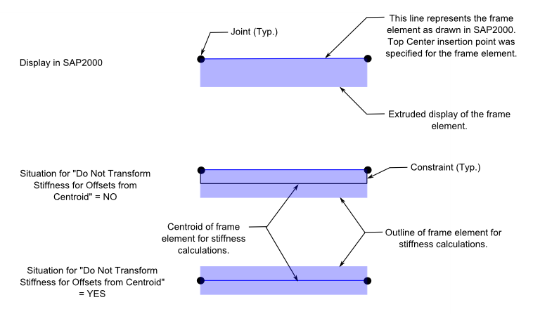 如果不希望插入點改變剛度,可勾選“剛度選項”中的復(fù)選框。此時,插入點的作用僅限于在拉伸視圖中形象直觀地顯示截面形狀和構(gòu)件位置,而不會影響結(jié)構(gòu)的分析結(jié)果。如圖3所示,展示了將插入點位置設(shè)置為“頂中”后的拉伸視圖效果,并對比了考慮與不考慮剛度轉(zhuǎn)換時的計算原理。