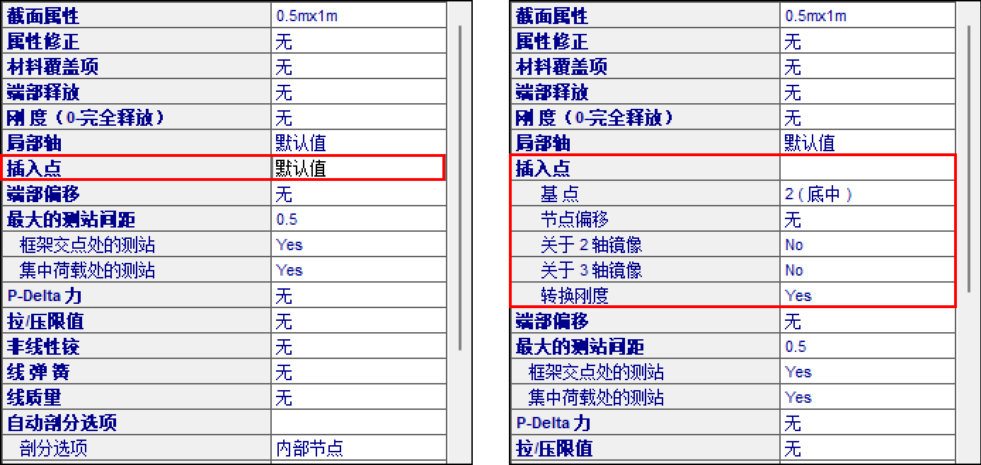 如圖4所示,依次為問題描述中兩根簡支梁的插入點設(shè)置。其中,左側(cè)簡支梁采用默認(rèn)設(shè)置,右側(cè)簡支梁的插入點設(shè)置為“底中”,并且“轉(zhuǎn)換剛度”選項為“是”,即考慮了因插入點位置改變所引起的剛度變化。