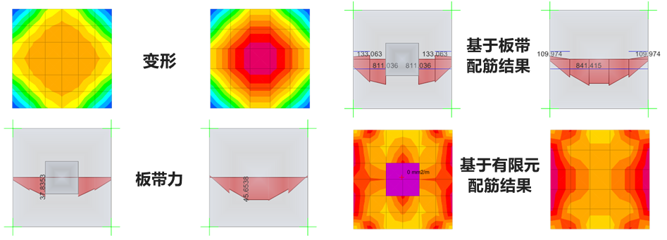 在模型中考慮剛域后,該區(qū)域不輸出內力和配筋結果。如圖2所示,剛域處的變形更小,板帶力顯示在剛域邊緣而非柱中心線位置,整體板帶力也有所減小。無論采用基于板帶還是有限元的設計方法,剛域處均不輸出配筋結果。