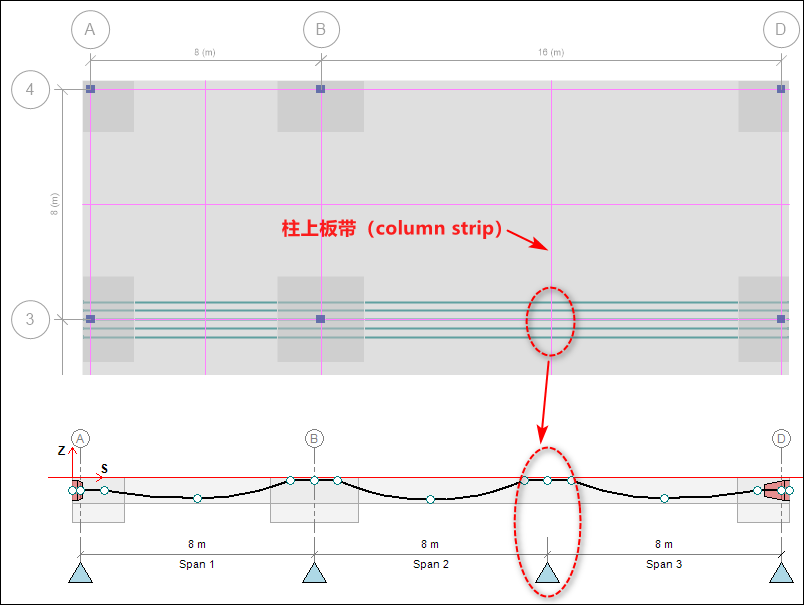 注意:無論是基于支承線還是基于設計板帶自動生成鋼束,如果希望某一交點被識別為支座,則與支承線或設計板帶相交的設計板帶必須設置為柱上板帶(Column Strip);跨中板帶(Middle