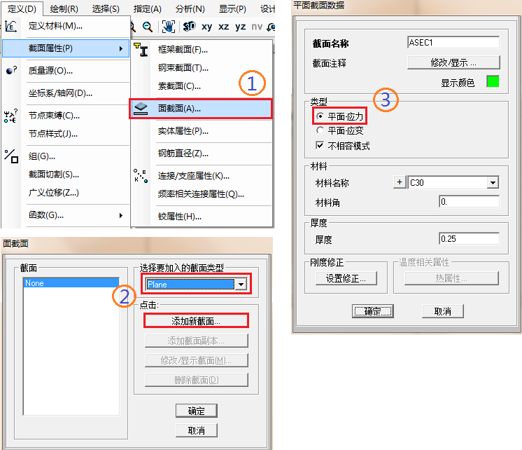 在滿足上述三條假定的基礎(chǔ)上,用戶可定義平面應變單元。具體方法和操作步驟如下所示: