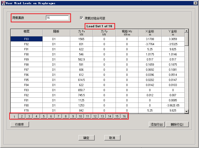 2.高亮顯示該荷載模式,點(diǎn)擊修改側(cè)向荷載命令,彈出如下圖所示的對(duì)話框。在荷載集數(shù)編輯框中輸入風(fēng)向角數(shù)量。通過(guò)切換不同的風(fēng)向角(對(duì)話框下端的編號(hào)),并在中間區(qū)域的編輯框中輸入相應(yīng)的數(shù)值(計(jì)算得到的風(fēng)荷載大小、作用點(diǎn)位置等信息),就可以通過(guò)隔板將風(fēng)荷載施加到結(jié)構(gòu)上。注意:通過(guò)這種方式只需一個(gè)荷載模式就可以將不同方向角的風(fēng)荷載施加到結(jié)構(gòu)上。