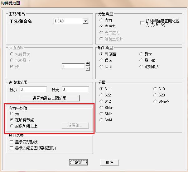 問題描述:運(yùn)行分析之后,通過 顯示>力/應(yīng)力>殼 命令,可以打開 構(gòu)件受力圖 對(duì)話框。在該對(duì)話框的 應(yīng)力平均值 區(qū)域有三個(gè)選項(xiàng): 無(wú)、在所有節(jié)點(diǎn)、對(duì)象和組之上。它們各自的作用是什么,分別適用于何種情況?