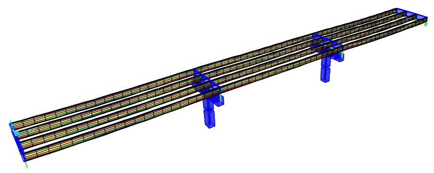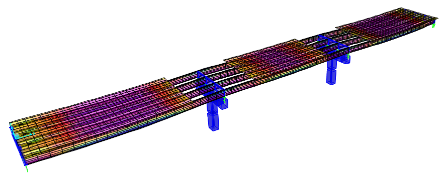 基于對(duì)象的建模方式回避了復(fù)雜的施工階段聯(lián)合截面的定義,實(shí)現(xiàn)快速建模。并可以選擇靈活的離散方案。不過(guò)要注意,將結(jié)構(gòu)離散為殼單元或?qū)嶓w單元時(shí),每個(gè)縱梁將采用獨(dú)立單元模擬,模型的邊界要能保證施工過(guò)程中不出現(xiàn)機(jī)構(gòu),不然某些情況下程序會(huì)報(bào)錯(cuò)。圖2為鋼混疊合梁離散為殼單元時(shí)的施工過(guò)程模擬結(jié)果。