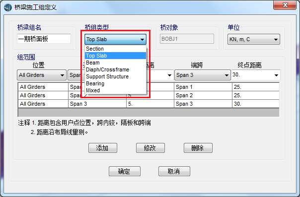 在CSiBridge中采用基于對(duì)象的方式定義用于施工階段分析的結(jié)構(gòu)組。用戶可以根據(jù)需要直接將主梁對(duì)象中的橋面板、鋼縱梁、橫隔板等子對(duì)象指定給結(jié)構(gòu)組,如圖1所示。當(dāng)用戶選擇橋梁對(duì)象的離散方式時(shí)(梁?jiǎn)卧卧?shí)體單元),程序自動(dòng)將子對(duì)象內(nèi)生成的單元指定給對(duì)應(yīng)的組。只有當(dāng)橋梁對(duì)象離散為梁?jiǎn)卧獣r(shí)程序自動(dòng)采用與“施工階段聯(lián)合截面”類(lèi)似的方式處理。