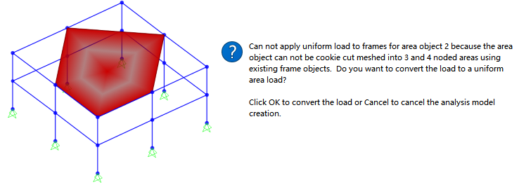 對(duì)于邊數(shù) N≥5 的不規(guī)則多邊形面,如果與其共面的框架對(duì)象不能將其分割成三角形或四邊形,SAP2000 將提示“無法施加『導(dǎo)荷至框架的均布面荷載』,是否將其轉(zhuǎn)換為常規(guī)的均布面荷載?”,如下所示。此時(shí),用戶既可點(diǎn)擊【確定】按鈕,轉(zhuǎn)換為常規(guī)的均布面荷載;也可點(diǎn)擊【取消】按鈕,適當(dāng)修改模型后實(shí)現(xiàn)“面荷載導(dǎo)荷至框架”。