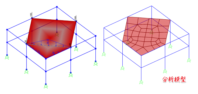 根據(jù)以上右圖所示的 SAP2000 提示信息可知,用戶只需適當(dāng)添加框架對(duì)象,保證當(dāng)前的五邊形面能被分割為三角形或四邊形。如以下左圖所示,沿五邊形的兩個(gè)頂點(diǎn)繪制 虛 梁(框架截面為 None),即可將均布面荷載導(dǎo)致至框架。由于當(dāng)前并未對(duì)五邊形面沿該虛梁進(jìn)行幾何分割,故 SAP2000 自動(dòng)生成如以下右圖所示的分析模型。