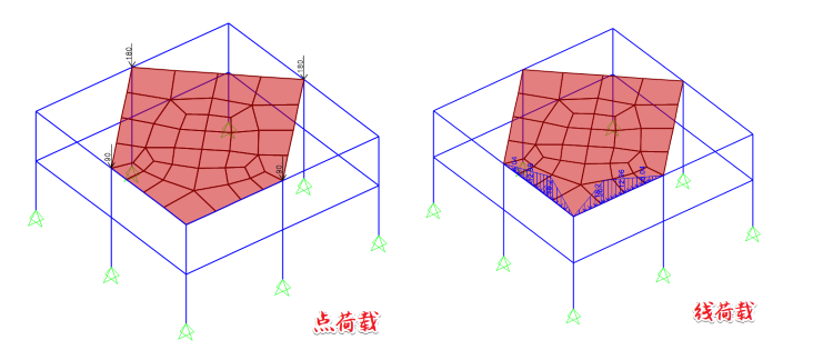 第二,如果三角形或四邊形的邊上 不 存 在 框架對(duì)象,上述線荷載將以靜力等效的原則轉(zhuǎn)換為節(jié)點(diǎn)荷載,施加在三角形或四邊形的角節(jié)點(diǎn)上。