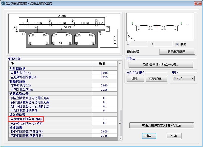 在CSiBridge中上部結(jié)構(gòu)和下部結(jié)構(gòu)的偏移量需要分別設(shè)置。上部結(jié)構(gòu)的偏移量在構(gòu)件>上部結(jié)構(gòu)>橋截面>從參考點(diǎn)到插入點(diǎn)X偏移中設(shè)置,如下圖所示。