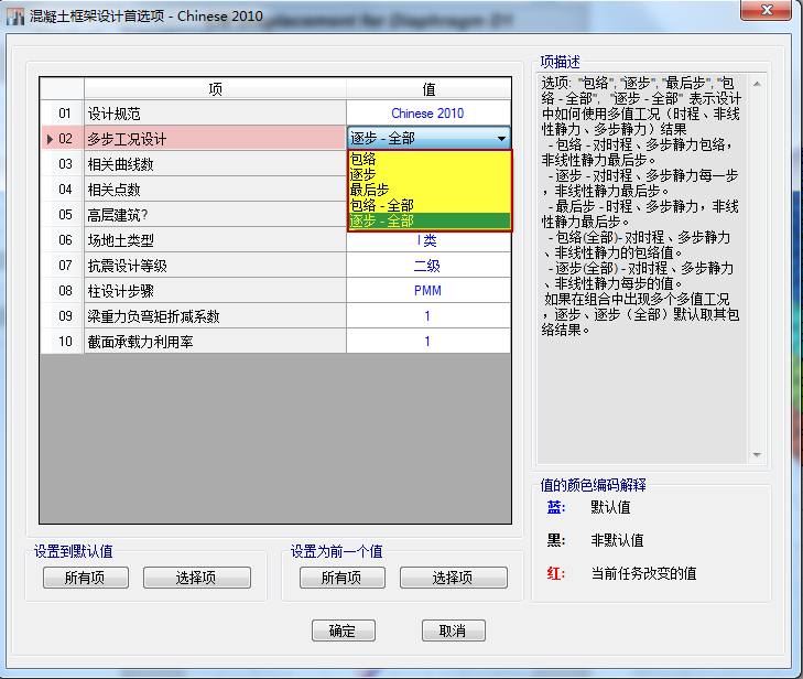 該項用于控制設(shè)計時如何使用多值工況的分析結(jié)果。其中,此處的多值工況包括:時程工況、非線性靜力工況、多步靜力工況。