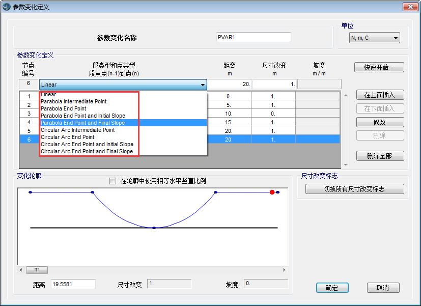 參數(shù)變化定義對話框位于構(gòu)件選項卡>上部結(jié)構(gòu)面板>參數(shù)變化項>新建,用于指定上部結(jié)構(gòu)幾何尺寸參數(shù)或荷載參數(shù)沿橋跨長度的變化值函數(shù)。該函數(shù)可以采用分段函數(shù)來定義,以描述復雜的順橋向參數(shù)變化。所以需要用戶定義分段點和各段函數(shù)的類型。