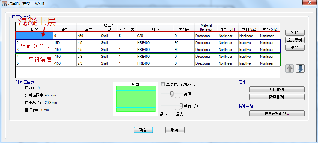 按照分層殼理論定義剪力墻模型,最直觀的情況是將剪力墻分為5層,包括:混凝土層,豎向、水平鋼筋各兩層,如下圖2所示。