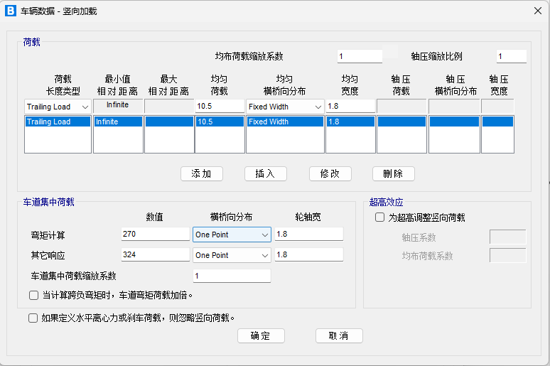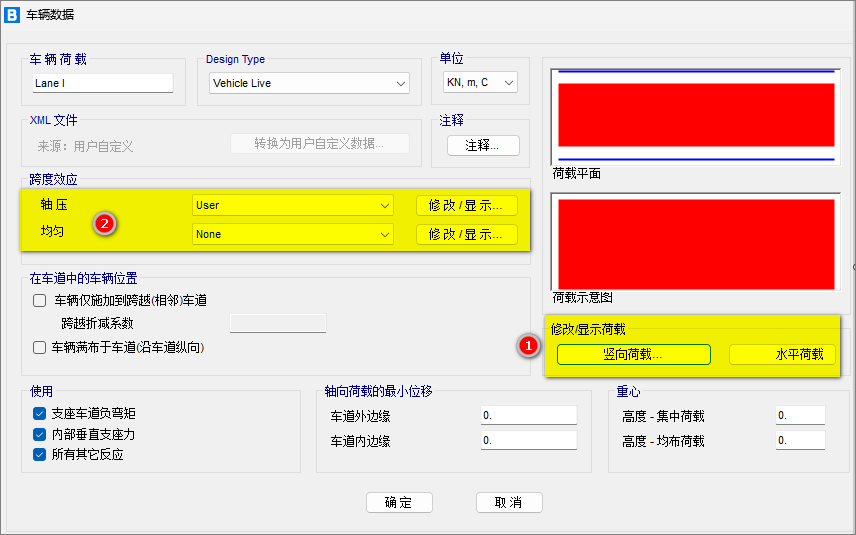 (1)在上圖圖示①中定義車輛荷載中豎向荷載的大小,這里包括了集中荷載和車道荷載。其中車道荷載在“荷載”一欄中定義,這里采用Traling