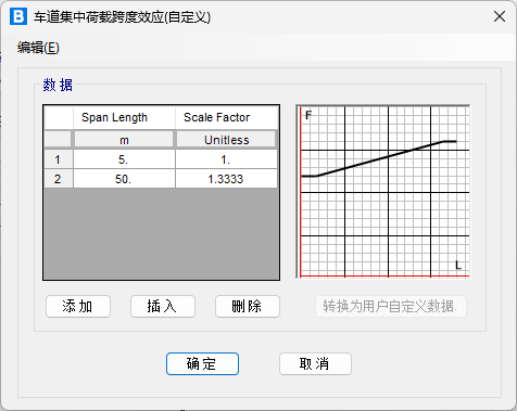 (2)通過圖示②中的長(zhǎng)度影響系數(shù)調(diào)整集中荷載的大小。這里僅需要考慮集中荷載隨橋梁跨度的改變,點(diǎn)擊“軸壓”后的修改顯示中,在“車道集中荷載跨度效應(yīng)(自定義)”中輸入長(zhǎng)度影響系數(shù)曲線,如下圖所示。程序會(huì)自動(dòng)識(shí)別橋梁各跨的長(zhǎng)度,實(shí)際加載到結(jié)構(gòu)的集中荷載為此處的長(zhǎng)度影響系數(shù)乘以“車道集中荷載”的數(shù)值。例如,當(dāng)橋跨長(zhǎng)度小于5m時(shí),系數(shù)取1.0,集中荷載的大小為270x1.0=270,當(dāng)橋跨長(zhǎng)度大于50m時(shí),集中荷載的大小為270x1.333333=359.9991,符合規(guī)范要求。