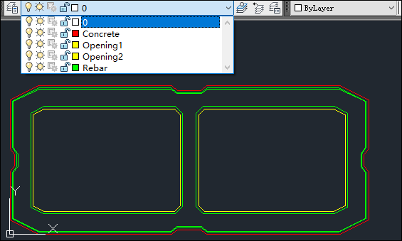 (2)圖層,導(dǎo)入DXF文件時(shí),程序依據(jù)圖層讀取截面信息,因此需要將不同的對(duì)象繪制在不同的圖層,以便在【導(dǎo)入設(shè)置】窗口中對(duì)不同的對(duì)象指定不同的屬性。如上圖中的空心橋墩截面,橋墩外輪廓線繪制在圖層Concrete中,空心橋墩內(nèi)側(cè)輪廓線繪制分別繪制在圖層opening1和opening2當(dāng)中;