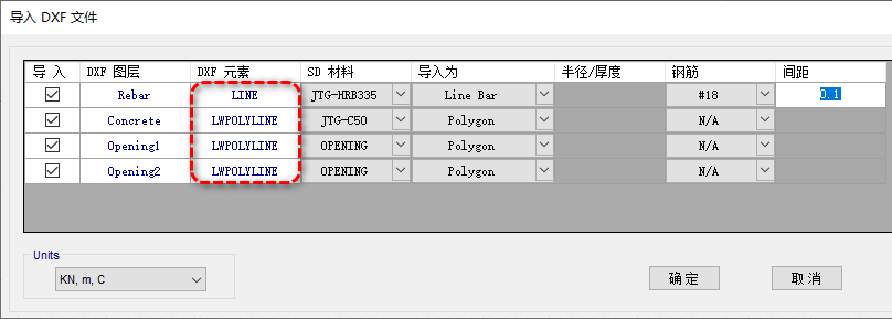 在【導(dǎo)入設(shè)置】窗口,程序會(huì)讀取DXF文件中每個(gè)圖層的信息,列出每個(gè)圖層中的圖元類型,如下圖中紅色選框中的內(nèi)容。依據(jù)圖元所代表的不同對(duì)象,用戶需要補(bǔ)充其材料信息、導(dǎo)入為、半徑/厚度、鋼筋、間距等信息。不同對(duì)象需要補(bǔ)充信息也不同相同,比如圖層concrete表示的時(shí)橋墩的外輪廓線,因此需要補(bǔ)充其SD材料,導(dǎo)入為多邊形,其他信息不用補(bǔ)充;圖層Rebar表示鋼筋的布置信息,因此需要補(bǔ)充鋼筋的材料信息、導(dǎo)入為鋼筋、鋼筋的型號(hào)、以及鋼筋的間距。具體設(shè)置如下圖所示。