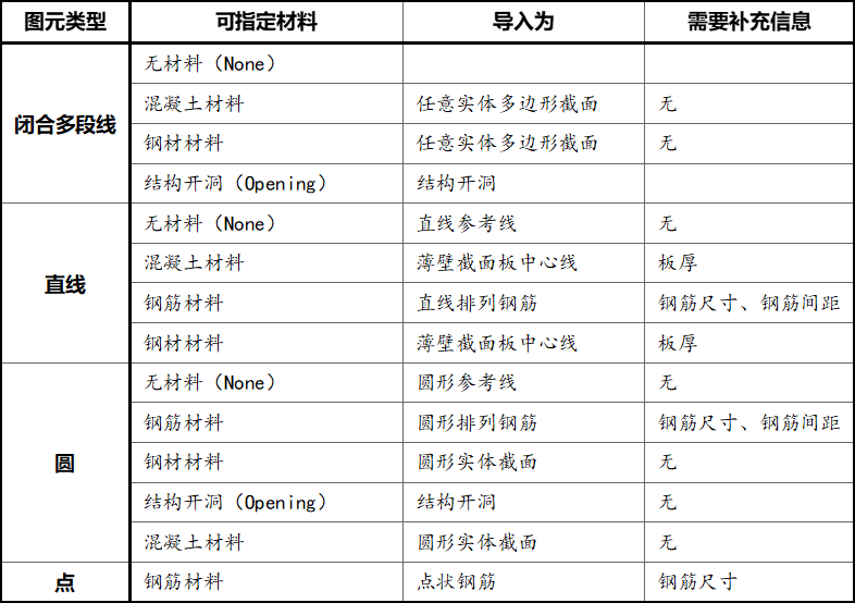 (3)圖元類型,截面設(shè)計(jì)器支持導(dǎo)入CAD的圖元類型包括閉合多段線、直線、圓、點(diǎn)。不同的圖元根據(jù)所指定材料的種類不同可以模擬為不同的對(duì)象,其對(duì)應(yīng)關(guān)系可以通過下列表格確定。如上圖中的空心橋墩截面,閉合多段線(圖層Concrete)用于表示橋墩的輪廓線、直線(圖層Rebar)表示截面鋼筋布置,不同圖元的材料及補(bǔ)充信息則需要在導(dǎo)入時(shí)的【導(dǎo)入設(shè)置】窗口中進(jìn)行設(shè)置。