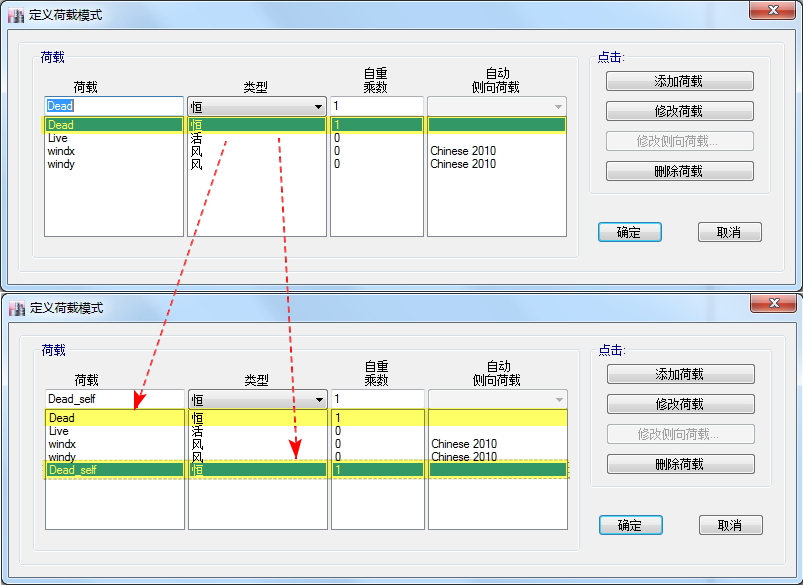 為方便進(jìn)行結(jié)構(gòu)自重查看,在如圖2所示的荷載模式定義中,增加荷載模式Dead_self,并設(shè)置其自重乘數(shù)為1,此時(shí), Dead_self中僅包含結(jié)構(gòu)自重。需要注意的是Dead_self僅僅用于檢查結(jié)構(gòu)自重,在進(jìn)行構(gòu)件設(shè)計(jì)時(shí),應(yīng)刪除此荷載模式及程序自動(dòng)生成的荷載工況,以避免影響程序的默認(rèn)荷載組合。