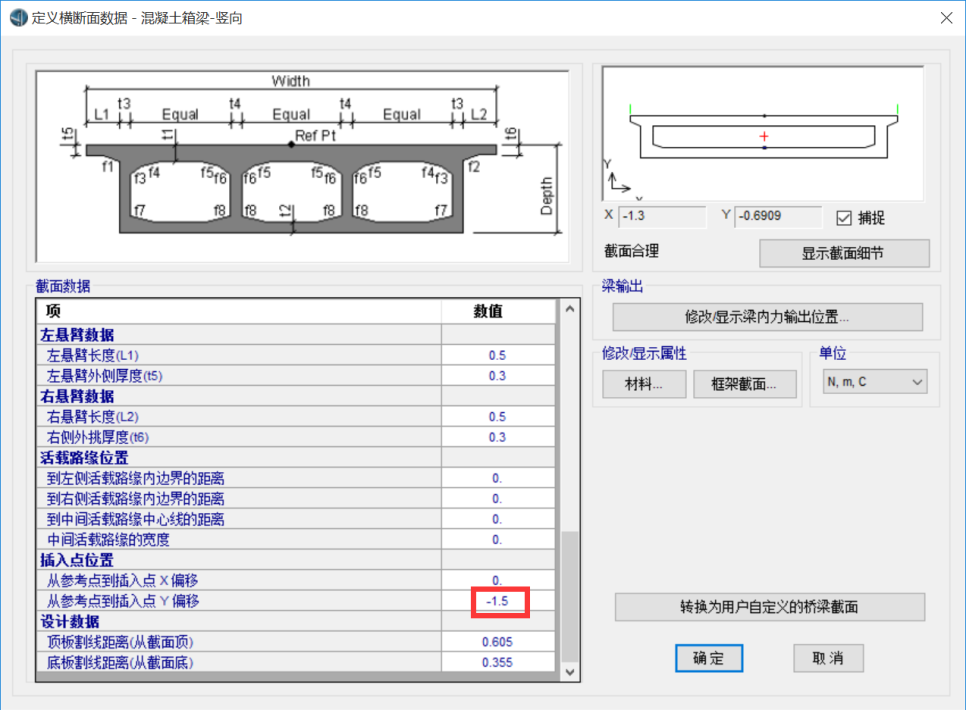 對(duì)于圖中展示的槽形截面可以在CSiBridge的上部結(jié)構(gòu)截面中先定義單箱單室的混凝土箱梁,主梁的截面定義如下圖所示。將上部結(jié)構(gòu)離散為實(shí)體單元。然后選中頂板的實(shí)體單元并,予以刪除即可得到相應(yīng)的槽形梁截面。