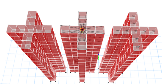 模型一(左):常規(guī)模型,剪力墻與樓板均無(wú)修正。