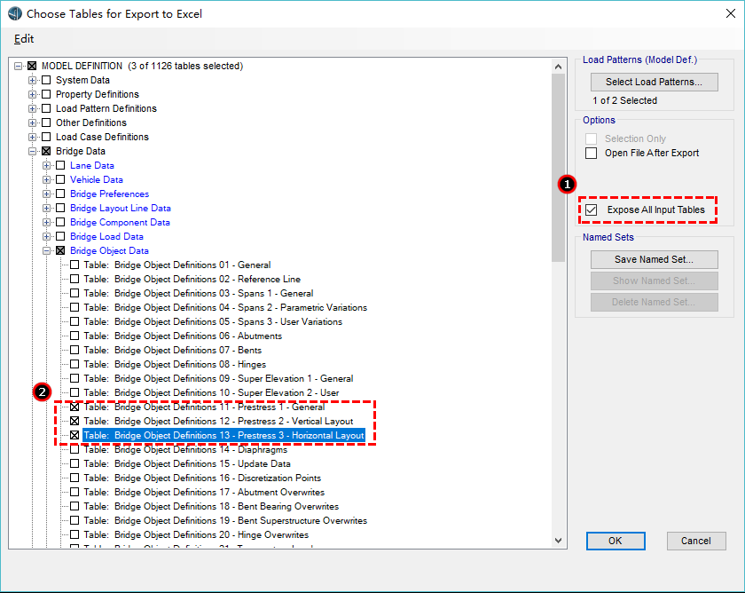 首先,定義一條預(yù)應(yīng)力鋼束,定義完成后,通過命令:【File】>【Export】>【Excel】,彈出如下對話框,勾選右側(cè)【Expose All Input Tables】,在該對話框左側(cè)會(huì)顯示更加詳細(xì)的列表。依次勾選【Bridge Date】>【Bridge Object Date】,分別勾選【Table Bridge Object Definitions 11 Prestress 1-General】;【Table Bridge Object
