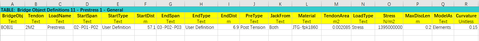 在 CSiBridge 可采用導(dǎo)入 Excel 的方式來批量定義預(yù)應(yīng)力鋼束。預(yù)應(yīng)力鋼束的輸入方法參考預(yù)應(yīng)力鋼束的輸入規(guī)則。導(dǎo)入時(shí),為避免導(dǎo)入格式出錯(cuò),建議先定義好一根預(yù)應(yīng)力鋼束并將其導(dǎo)出,之后用戶依據(jù)預(yù)應(yīng)力鋼束的輸入規(guī)則,將所有預(yù)應(yīng)力鋼束信息整理好后填入該 Excel 表格中,而后將其導(dǎo)入軟件。具體操作步驟如下