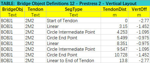 【Bridge Obj 12-Pre2-Vert】和【Bridge Obj 13-Pre3-Horiz】:這兩個(gè)工作簿中主要定義預(yù)應(yīng)力鋼束的豎直布置信息和水平布置信息,定義規(guī)則與軟件中輸入預(yù)應(yīng)力鋼束的規(guī)則一致,具體如下圖所示: