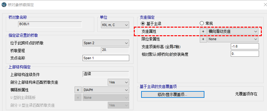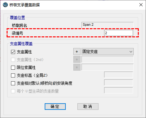 然后點(diǎn)擊【修改/顯示覆蓋項(xiàng)】,點(diǎn)擊添加新覆蓋項(xiàng),彈出下圖所示的窗口。這里需要注意的是所需覆蓋的支座編號(與下圖紅框中的梁編號對應(yīng))。軟件中以沿著橋梁大里程方向,從左往右依次對支座進(jìn)行編號。該案例中支座編號與支座布置圖中的編號一致,因此需將2號支座修改為固定支座。設(shè)置如下圖所示;