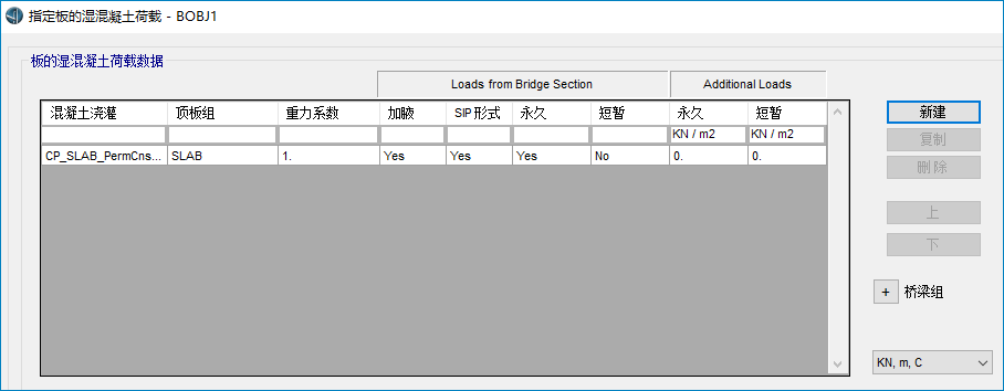 b.頂板組:用于確定所澆筑的混凝土節(jié)段所包含的頂板組,頂板組需要在【對象組】列表中定義。軟件會依據該組中包含的結構體積來計算相應的混凝土濕重。