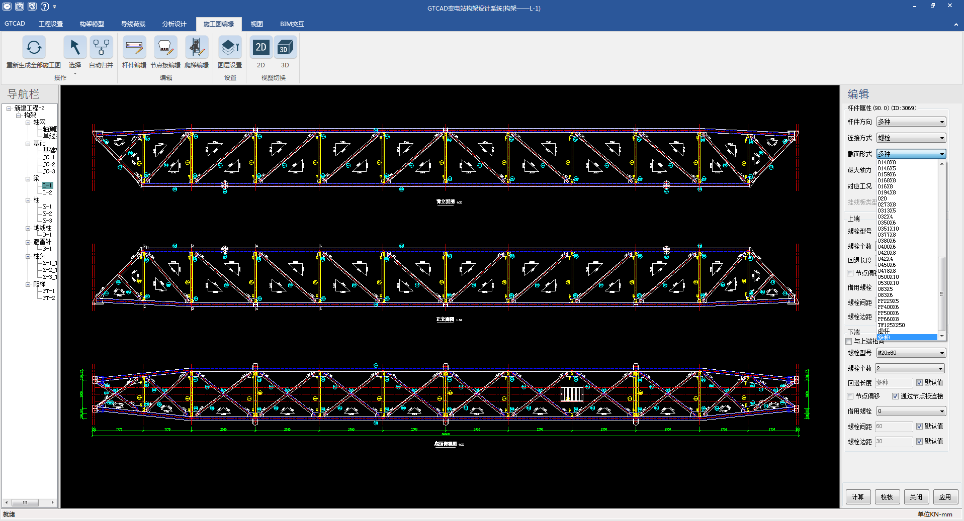 1. 自動(dòng)生成全套構(gòu)架設(shè)計(jì)施工圖,包括構(gòu)架軸測(cè)圖、基礎(chǔ)布置圖、基礎(chǔ)施工圖、梁施工圖、柱施工圖、地線柱施工圖、避雷針施工圖、柱頭、爬梯施工圖等,同時(shí)可自動(dòng)歸并統(tǒng)計(jì)生成桿件明細(xì)表、螺栓明細(xì)表、節(jié)點(diǎn)板明細(xì)表等各種材料統(tǒng)計(jì)表