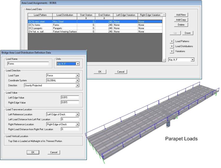 可以用任意定義的荷載樣式指定橋梁對(duì)象荷載,可以包括表面覆蓋、欄桿、格柵、隔板、主梁、橋面板等引起的荷載。