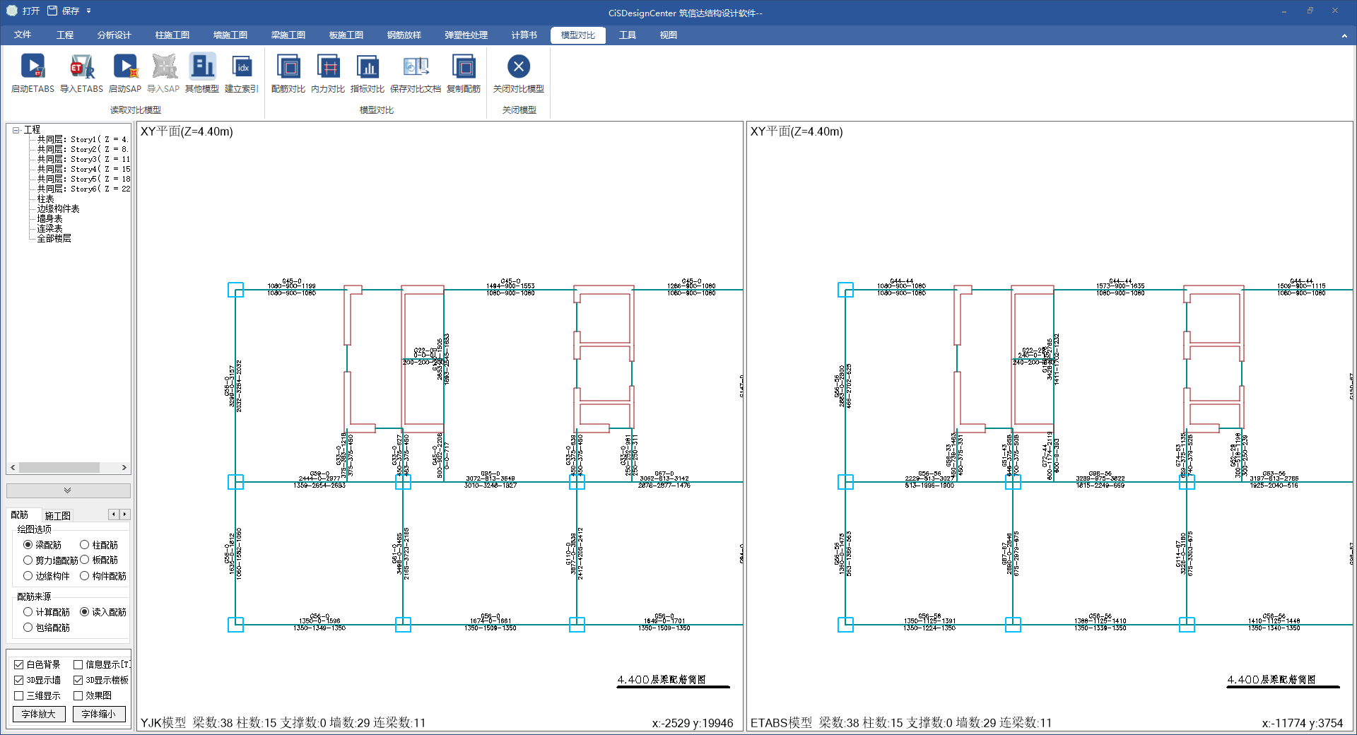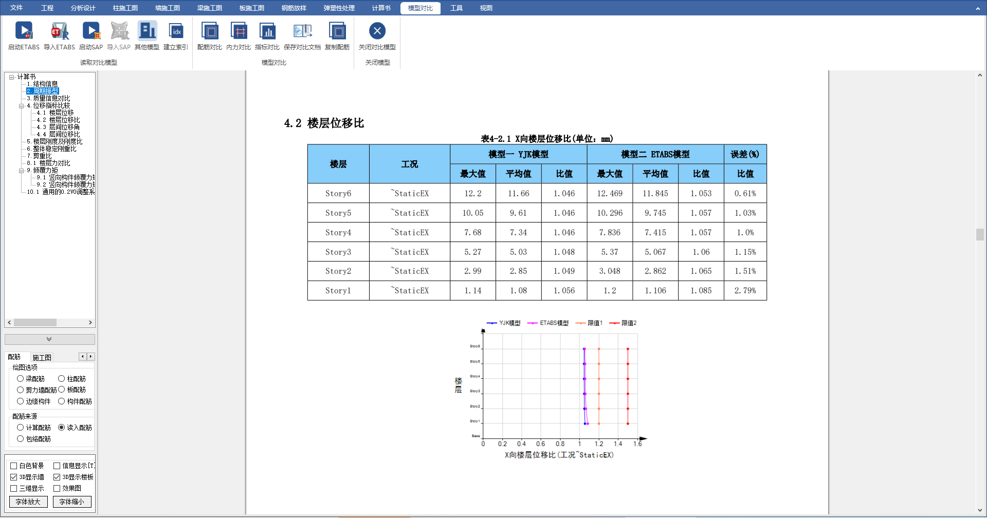 為了便于用戶對項(xiàng)目進(jìn)行二套軟件校核,CiSDC提供了不同模型的結(jié)構(gòu)指標(biāo)對比報(bào)告書,構(gòu)件內(nèi)力對比以及配筋對比等功能。