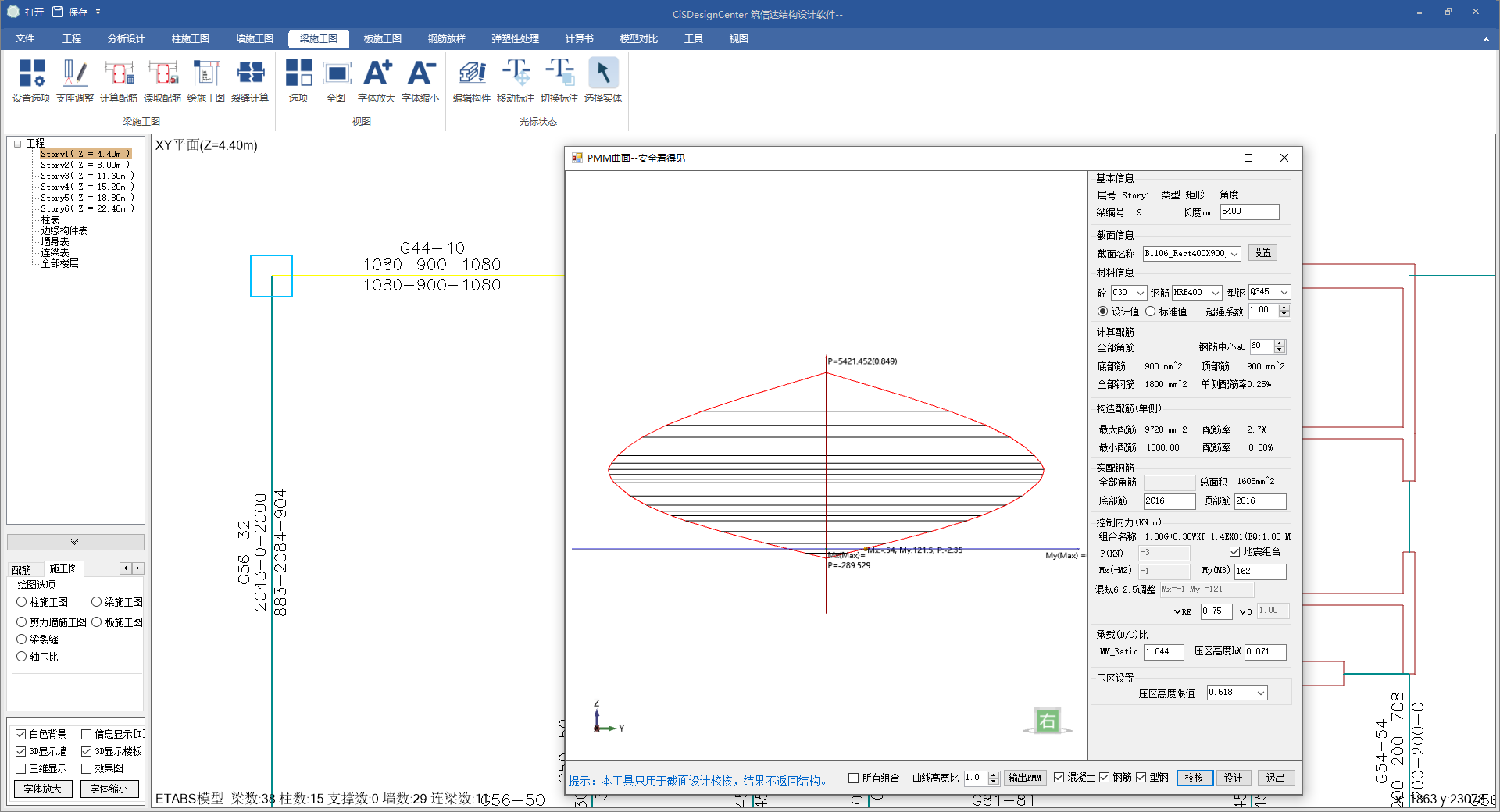 柱基于PMM法完成雙偏壓設(shè)計(jì)。PMM曲面對話框中可以顯示構(gòu)件設(shè)計(jì)詳細(xì)信息,它也是一個構(gòu)件設(shè)計(jì)與校核工具,在此可設(shè)置構(gòu)件截面、材料信息、實(shí)配鋼筋、內(nèi)力值,進(jìn)行構(gòu)件的校核和設(shè)計(jì)。設(shè)計(jì)工具中包含截面設(shè)計(jì)器,其截面設(shè)計(jì)器可自定義任意截面形狀。
