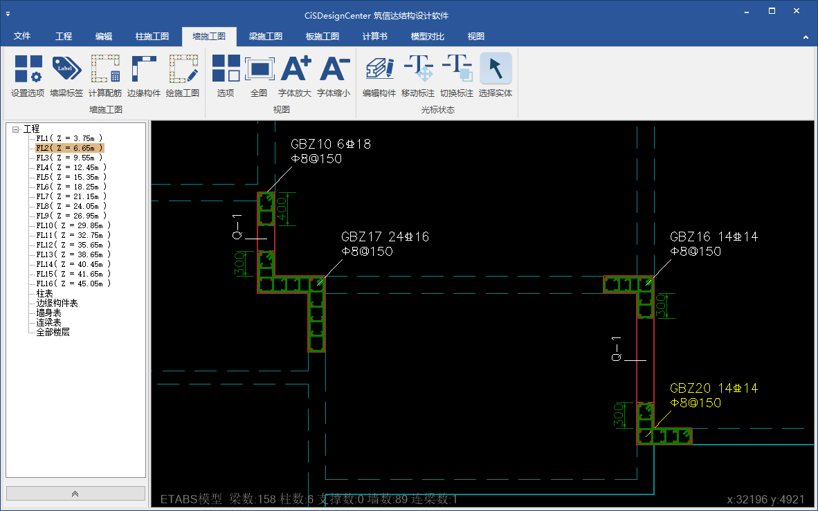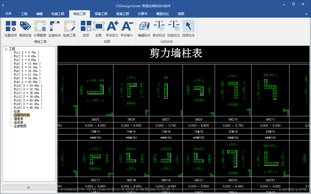 墻設(shè)計(jì)包含墻肢和連梁兩部分。CiSDC自動獲取ETABS中文版和SAP2000中文版模型中墻肢/連梁的設(shè)計(jì)內(nèi)力,根據(jù)規(guī)范進(jìn)行墻肢邊緣構(gòu)件縱筋及墻肢水平分布筋計(jì)算、墻肢穩(wěn)定校核、墻肢施工縫驗(yàn)算等,自動劃分邊緣構(gòu)件。