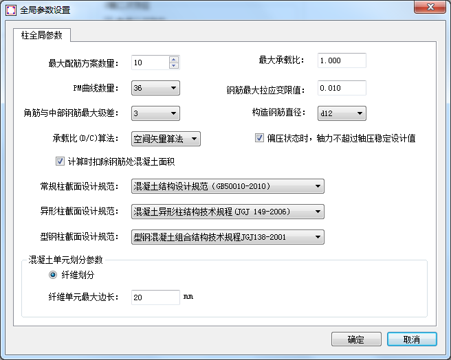 全局參數(shù)設(shè)置用于指定柱截面的計算參數(shù)、控制指標(biāo)、設(shè)計規(guī)范、纖維劃分等。