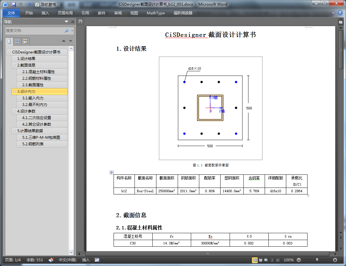 查看概要設(shè)計報告,顯示 CiSDesigner 截面設(shè)計計算書,也可保存為Word文檔。