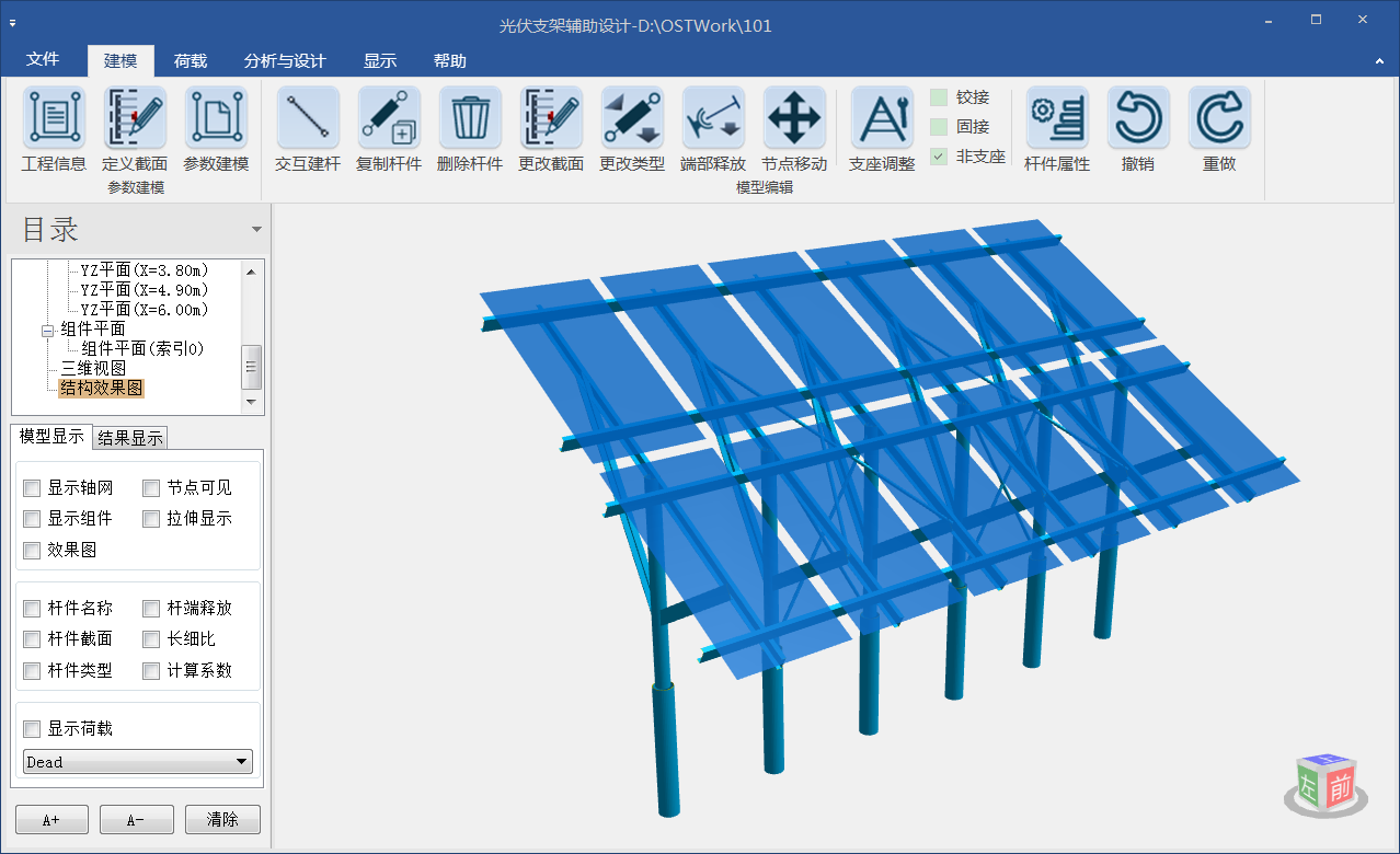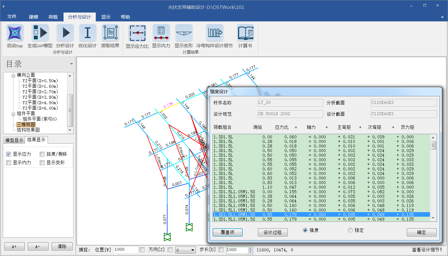 建模完成后,調(diào)用SAP2000中文版軟件生成模型,并進(jìn)行分析與設(shè)計(jì),生成的SAP2000中文版模型是一個(gè)單獨(dú)的文件,分析完成后,可以在SAP2000中文版中查看分析結(jié)果,也可以直接光伏支架軟件中查看分析結(jié)果,包括分析內(nèi)力、變形、撓度等結(jié)果。