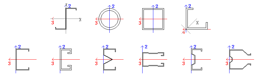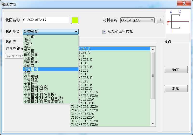 軟件可以定義的冷彎截面形式如圖5所示,其中方鋼管、等邊角鋼、槽鋼、卷邊槽鋼、卷邊Z形鋼內(nèi)置了《冷彎薄壁型鋼結(jié)構(gòu)技術(shù)規(guī)程》附錄中的截面,可以按照截面名稱進(jìn)行導(dǎo)入。