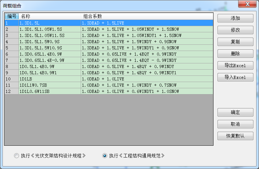 在建模過程中做了自動(dòng)化處理,如桿件端部約束關(guān)系的指定、荷載組合自動(dòng)生成、荷載自動(dòng)計(jì)算等,同時(shí)也提供編輯窗口可以對(duì)其進(jìn)行編輯。荷載組合根據(jù)規(guī)范自動(dòng)生成,集成了新舊版本的規(guī)范。荷載組合支持編輯,可以在軟件中直接編輯,也可以導(dǎo)出為Excel文件進(jìn)行編輯。