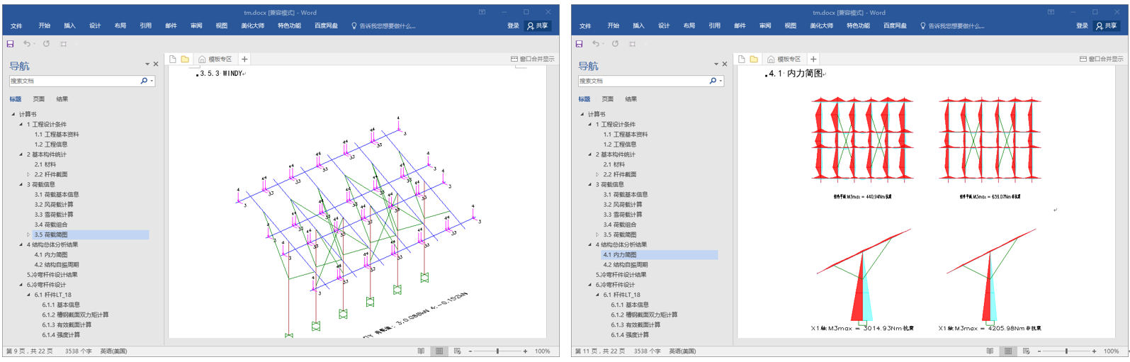 計(jì)算書部分可以設(shè)置輸出的計(jì)算內(nèi)容,在輸出冷彎構(gòu)件的設(shè)計(jì)結(jié)果時(shí),可以按照表格方式輸出,也支持設(shè)計(jì)過程輸出。如圖15所示。在計(jì)算書中,也輸出了荷載簡圖和內(nèi)力簡圖。