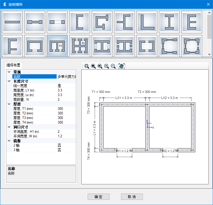 定制化的墻體布局模板幫助用戶輕松地定義墻截面屬性,鼠標單擊即可繪制多層墻體。當使用繪制墻垛命令繪制剪力墻時,程序自動指定所有的墻肢和連梁標簽。
