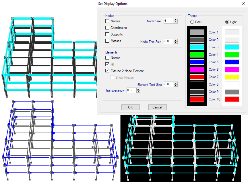 - 新增顯示操作選項:控制顯示對象及文本的大小,選擇顯示或深或淺的顏色主題,切換拉伸視圖,顯示節(jié)點或單元的編號