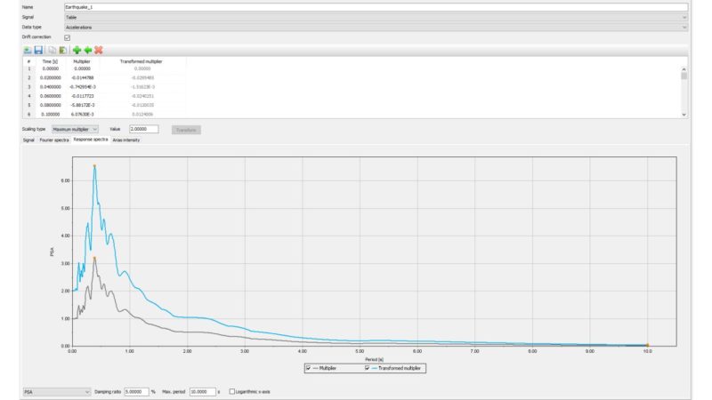 對(duì)于在動(dòng)力【乘子 → 位移乘子】對(duì)話(huà)框中以表格形式輸入的加速度數(shù)據(jù),用戶(hù)可對(duì)其整體縮放或基于最大乘子進(jìn)行縮放,也可點(diǎn)擊【復(fù)制】按鈕快速?gòu)?fù)制任意縮放后的加速度數(shù)據(jù)。除此之外,用戶(hù)也可以在 Input 中分別觀察原始數(shù)據(jù)和縮放數(shù)據(jù)的傅里葉譜、響應(yīng)譜以及地震強(qiáng)度曲線(xiàn)。