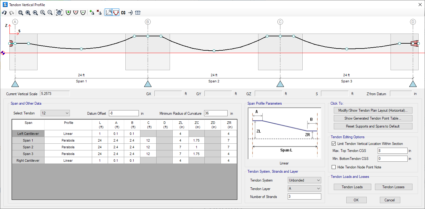 交互式鋼束編輯器簡化了布置鋼束縱向剖面的任務(wù)。也可以基于板帶位置和方向自動(dòng)布置鋼束。