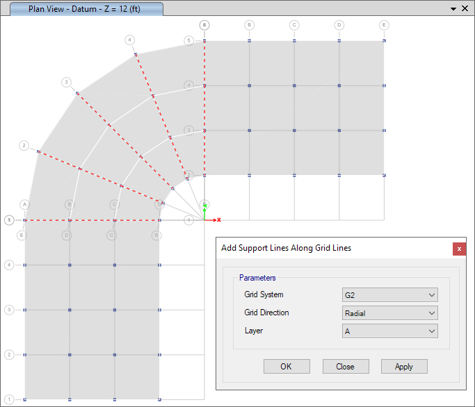支承線用于更快地對(duì)設(shè)計(jì)板帶和鋼束布置進(jìn)行建模。可以在屏幕中直接繪制和編輯,也可以沿網(wǎng)格線自動(dòng)生成。