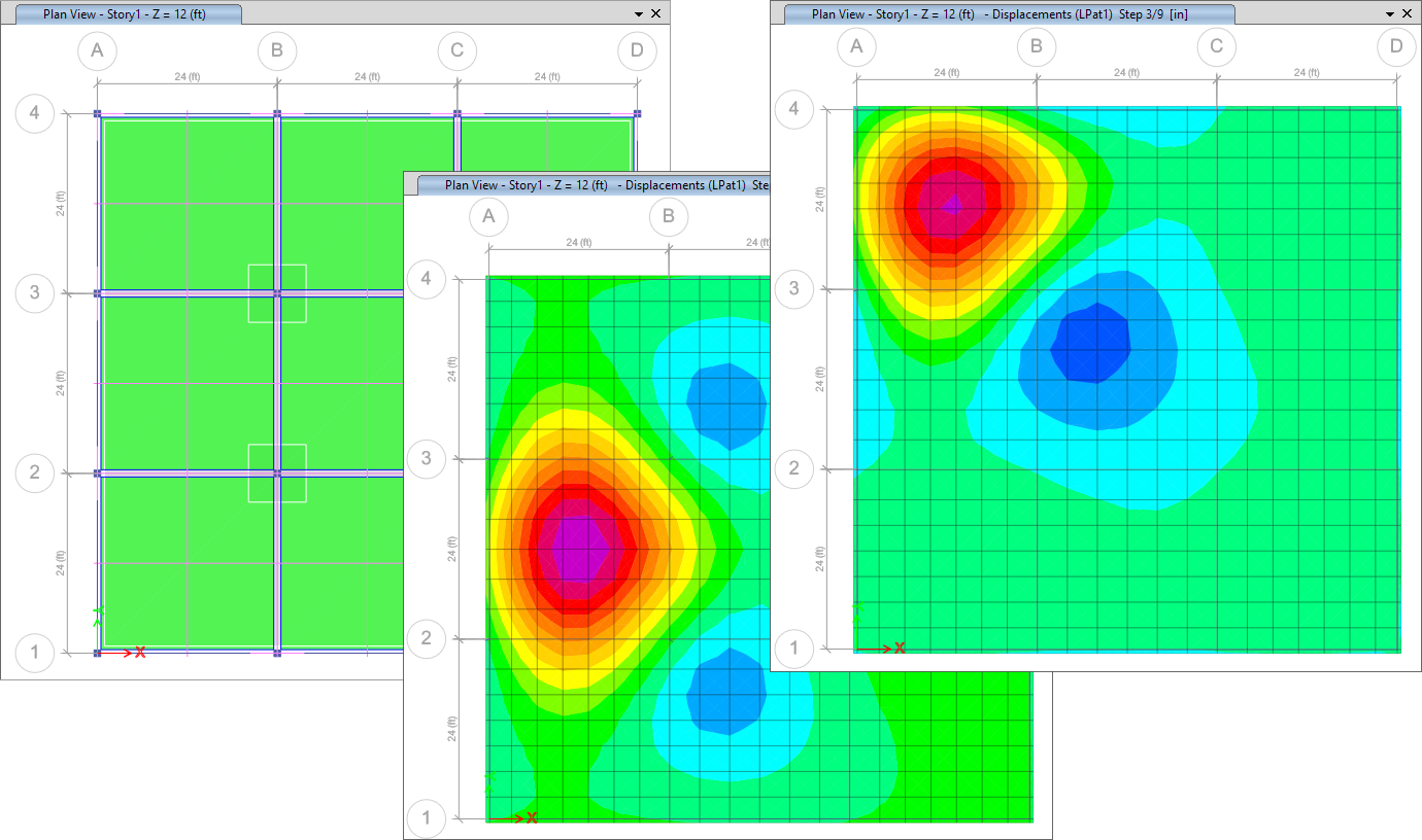 板塊可以基于軸網(wǎng)或支承線自動(dòng)生成,也可以由用戶繪制。它們依附在樓板體系,借助板塊可以施加用于分析活荷載不利布置的活荷載分布樣式,也可用于提取中間板塊位移和土壓力的數(shù)據(jù)報(bào)告。