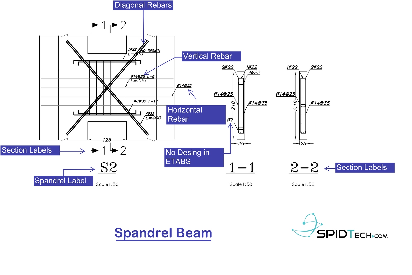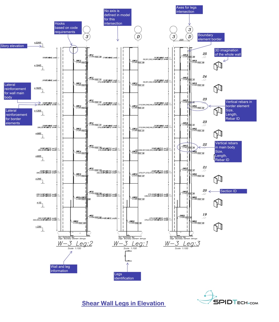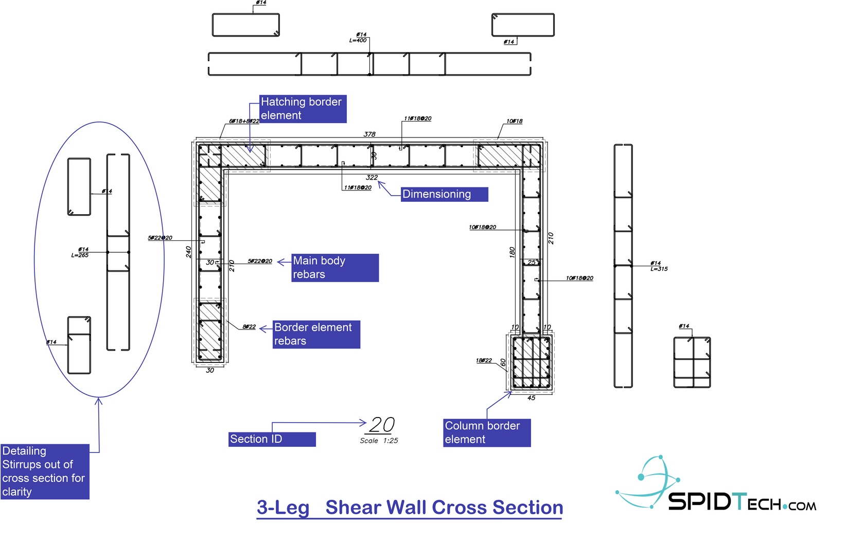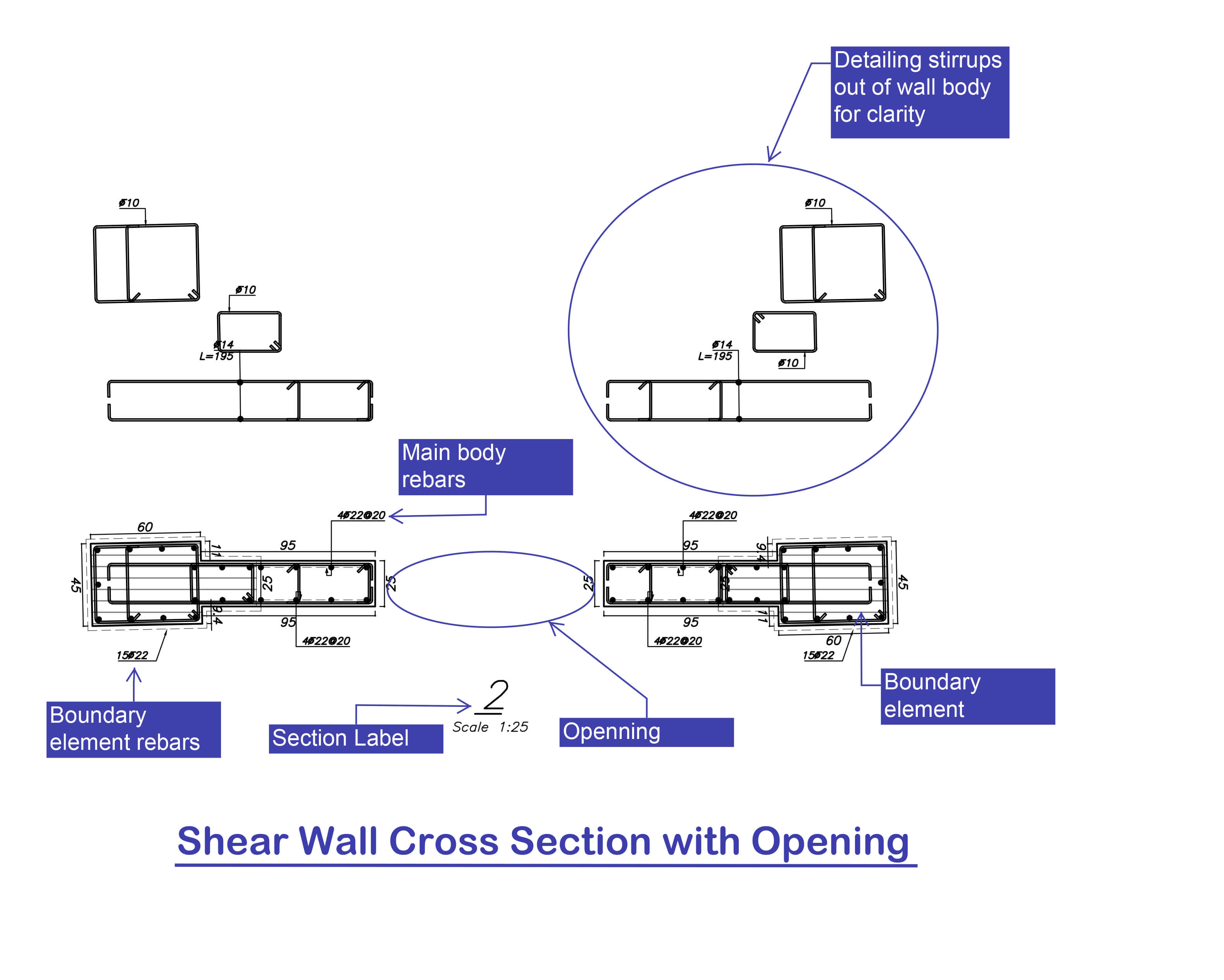 根據(jù)剪力墻立面的詳細(xì)信息,可以獲得墻任何位置的橫截面。這些截面顯示了墻的縱向和橫向鋼筋。在配筋方面,SPIDER截面也顯示了邊緣構(gòu)件的配筋。截面幾何、開洞、尺寸、保護(hù)層和比例是在剪力墻截面上顯示的其他結(jié)構(gòu)數(shù)據(jù)。此外,為了清楚起見,在橫截面之外詳細(xì)繪制了箍筋。