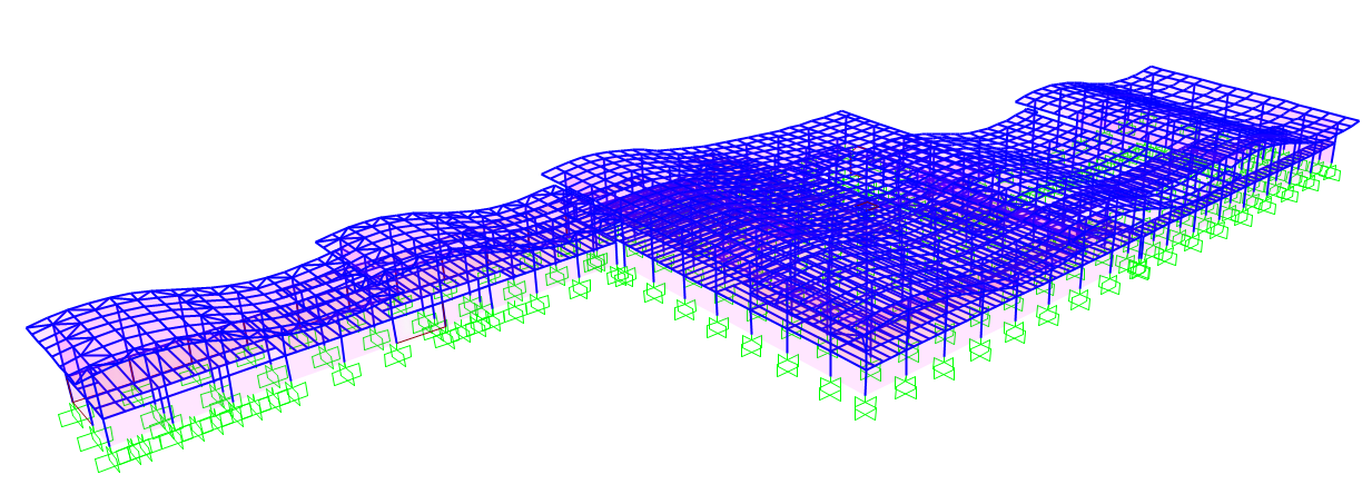 出現(xiàn)內(nèi)力異常的原因在于該模型對各樓層、以及波浪屋面均設(shè)置了剛性隔板。剛性隔板范圍內(nèi)的節(jié)點(diǎn)無平面內(nèi)相對位移,而該模型顯然不滿足剛性隔板假定,采用剛性隔板將導(dǎo)致內(nèi)力傳遞不符合實(shí)際情況。